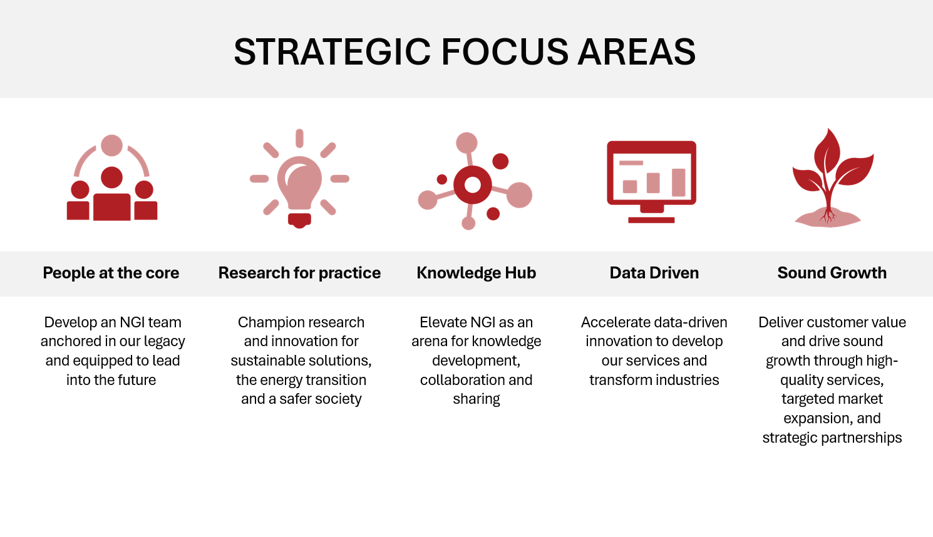 Strategien styrker også vår rolle i det grønne energiskiftet, robust infrastruktur og samfunnssikkerhet — områder der etterspørselen øker, og hvor NGIs ekspertise er viktigere enn noen gang.
