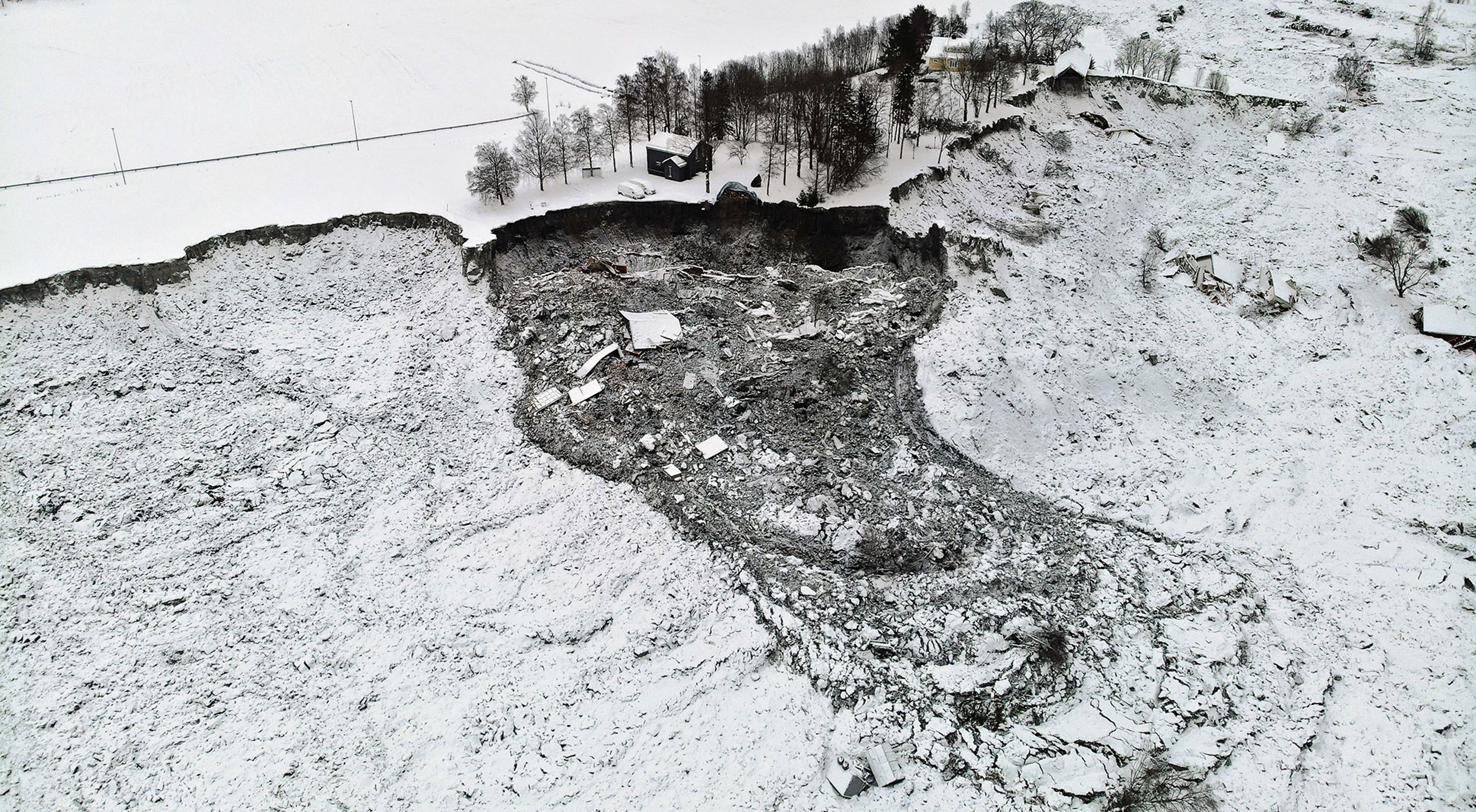 Luftfoto som viser omfanget av kvikkleireskredet i Gjerdrum i desember 2020 der store landområder kollapset momentant. ( Foto: NGI)