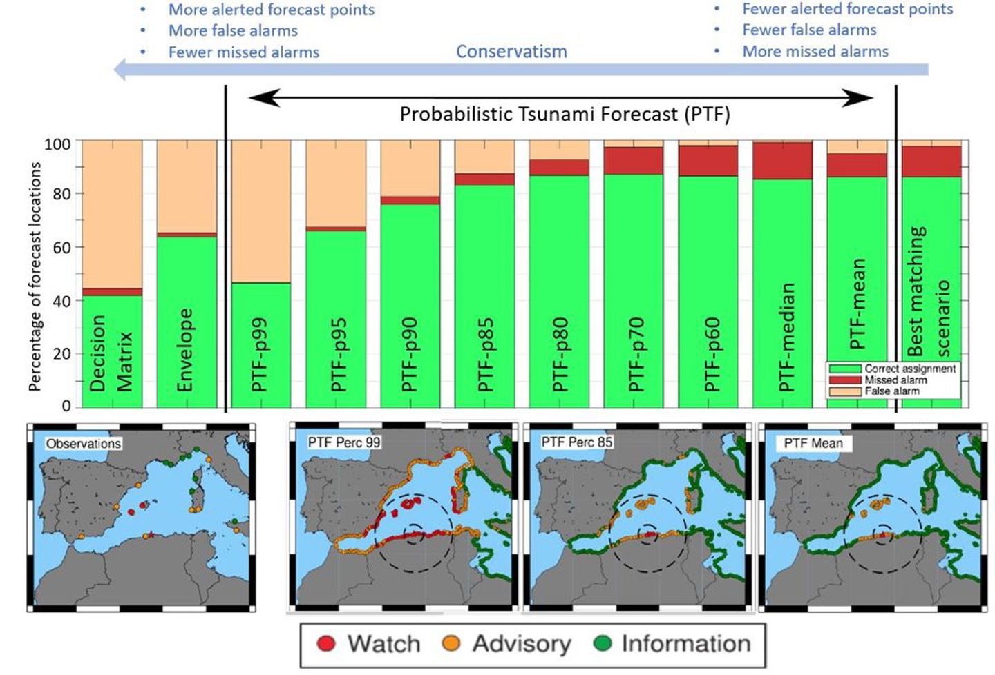 Håndteringen av risikoen for både falske varsler og underestimering av tsunamifare i varslingssystemer må bestemmes politisk. Samtidig må beslutningstagere ha riktig informasjon om usikkerheten. PTF metoden tar hensyn til denne usikkerheten, og likner på den måten moderne metoder for værvarsling, ved at den samtidig simulerer utfallet av mange alternative jordskjelv og påfølgende tsunamier.
