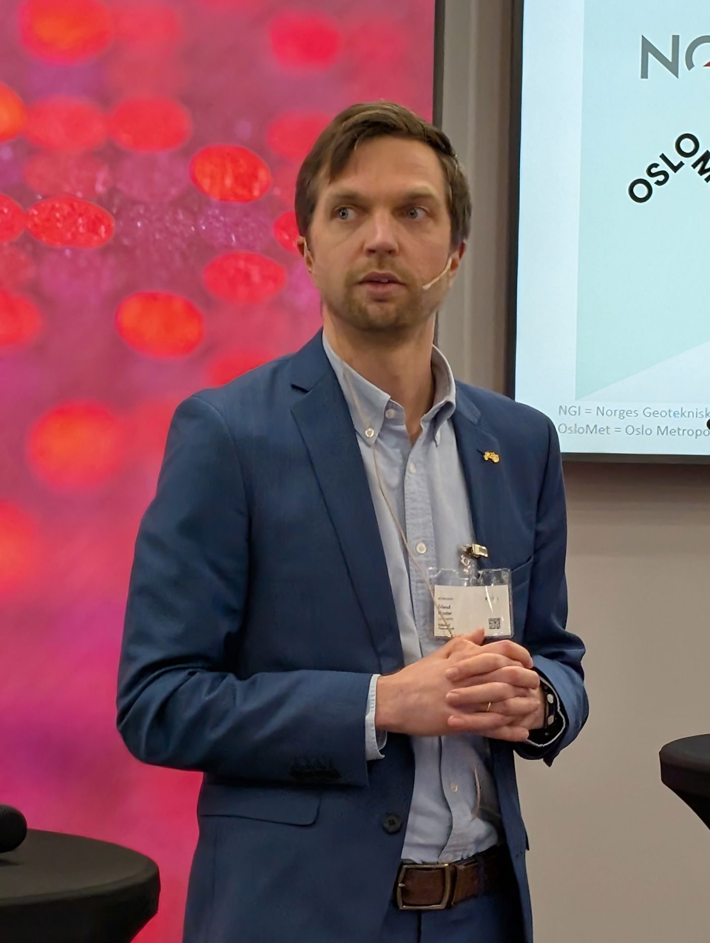 Erlend Risdal Moster leder ResiTrans fra NGI. Da han tok ordet etter ministeren, var budskapet hans konkret: Ekstremværet «Hans» i 2023 var bare begynnelsen.