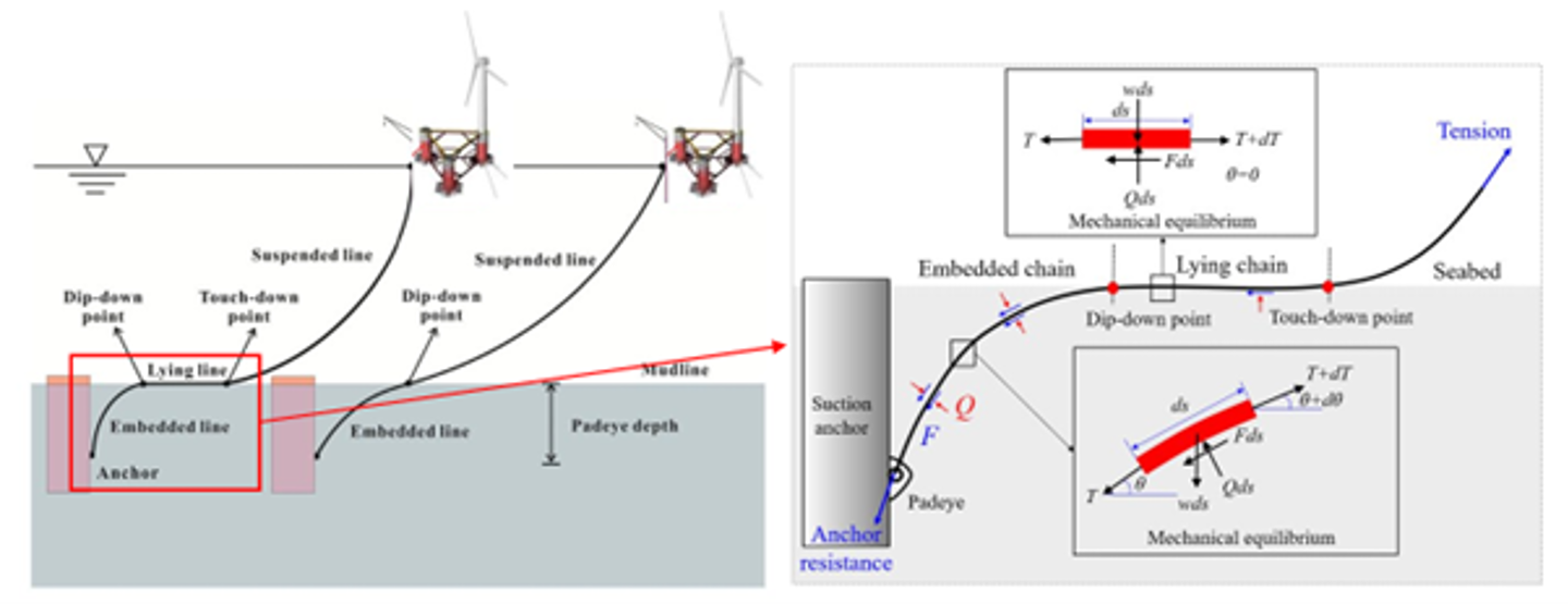 - Main task 2 – Calculate the chain configurations from the seabed to the pad-eye of suction anchors using traditional limit equilibrium equations. These calculations give the line tension and inclination at the pad eye. Calculate the suction anchor's required dimensions (diameter and penetration depth) for a given soil profile.
