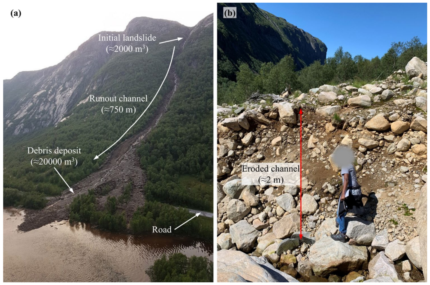 Figure 1. (a) Hunnedalen debris flow; (b) Erosion of the channel. (taken from Vicari, H., Tran, Q.A., Nordal, S. Thakur V. MPM modelling of debris flow entrainment and interaction with an upstream flexible barrier. Landslides (2022).