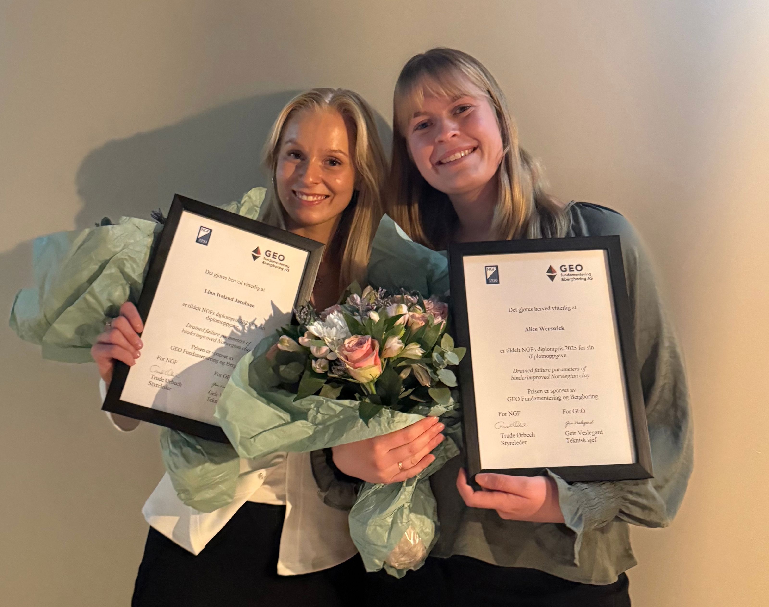 Linn Iveland Jacobsen (left) and Alice Werswick after receiving the award for best master’s thesis at Geoteknikkdagen 2025, honoured for their joint work on sustainable improvement of Norwegian clays. ( Photo: Migle Klincaraite)