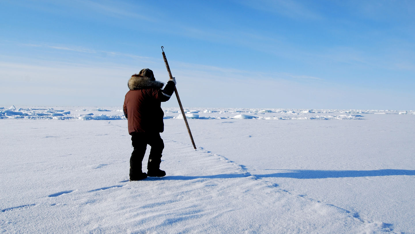 A hunter tests the ice for safety with a traditional ice pick, several kilometers out in Kotzebue Sound in northwest Alaska. ( Photo: Dyre Damman)