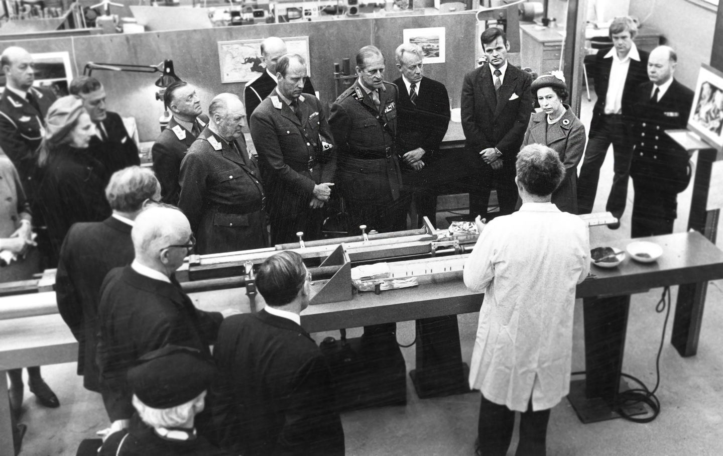 Toralv Berre showing quick clay to Queen Elizabeth II and Prince Philip during their royal visit to NGI in 1981.