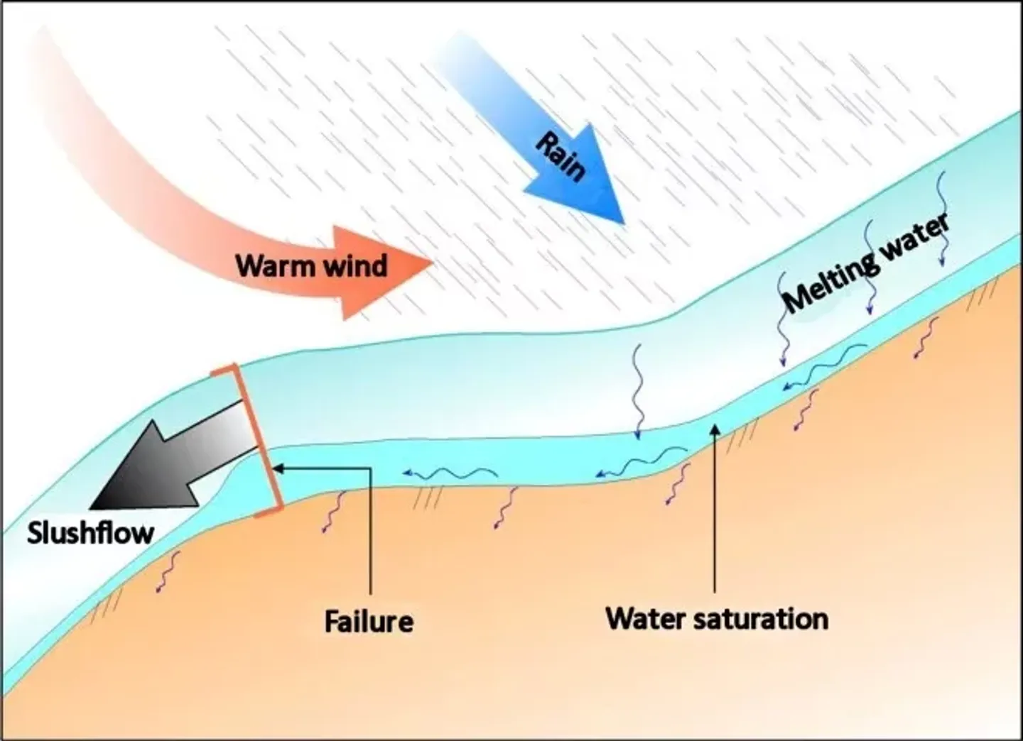 Slushflows are gravity driven mass flows consisting of a mixture of water and snow. They are observed globally in areas where a seasonal snow cover does occur. In maritime climate rain and snowmelt both contribute to the water needed to release slushflows, while intensive melting in springtime dominates in continental climates. Both processes may lead to a rapid increase of the water content in the snow cover. The bonds between individual snow crystals are weakened by the free water and the entire snowpack may become an unstable mixture of snow and water.