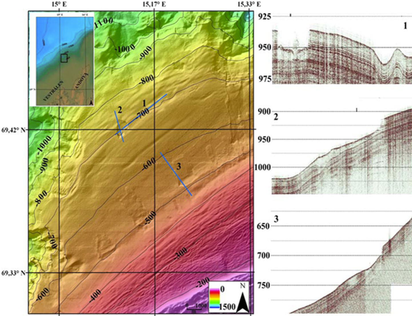 Figure 5: Swath bathymetry (MAREANO) and examples of HR-2D topas seismic profiles across landslides off the Vesterålen margin (CDog project).