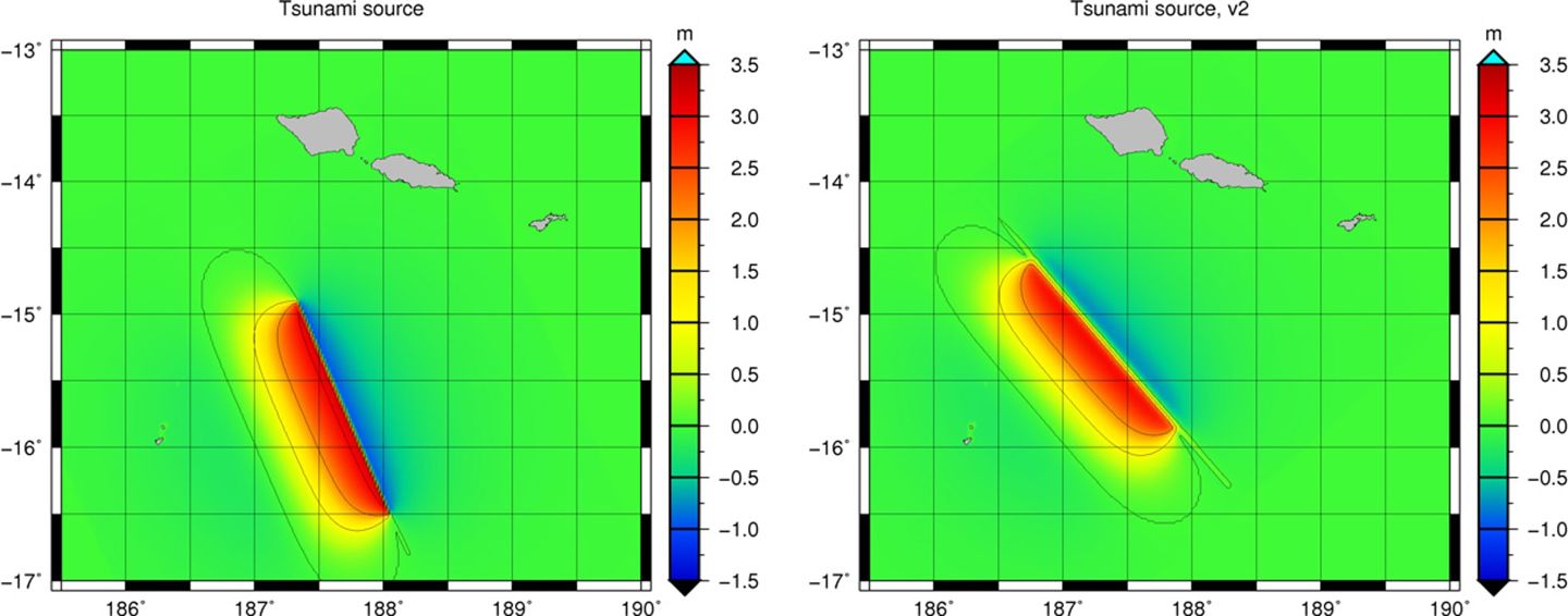 The reported magnitude of the earthquake southwest of Samoa islands ranges between Mw 8-8.3 on the Richter scale. Our earthquake sources are based on the combination of publicly available magnitude estimates, as well as seismic wave inversion by Yagi, and have a moment magnitude of Mw 8.1.