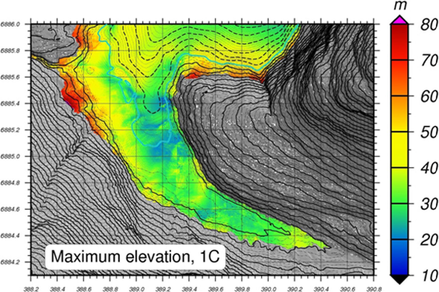 See also animations for more information from the numerical modeling of tsunami-generated rockslides: