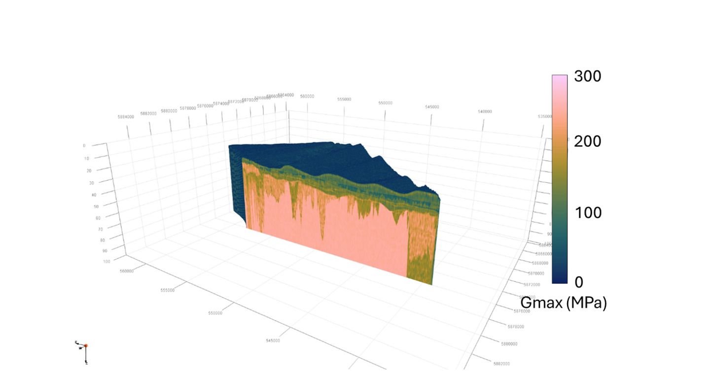 Figure 2 Example of Gmax predictions along seismic lines interpolated in 3D (NGI, 2025).