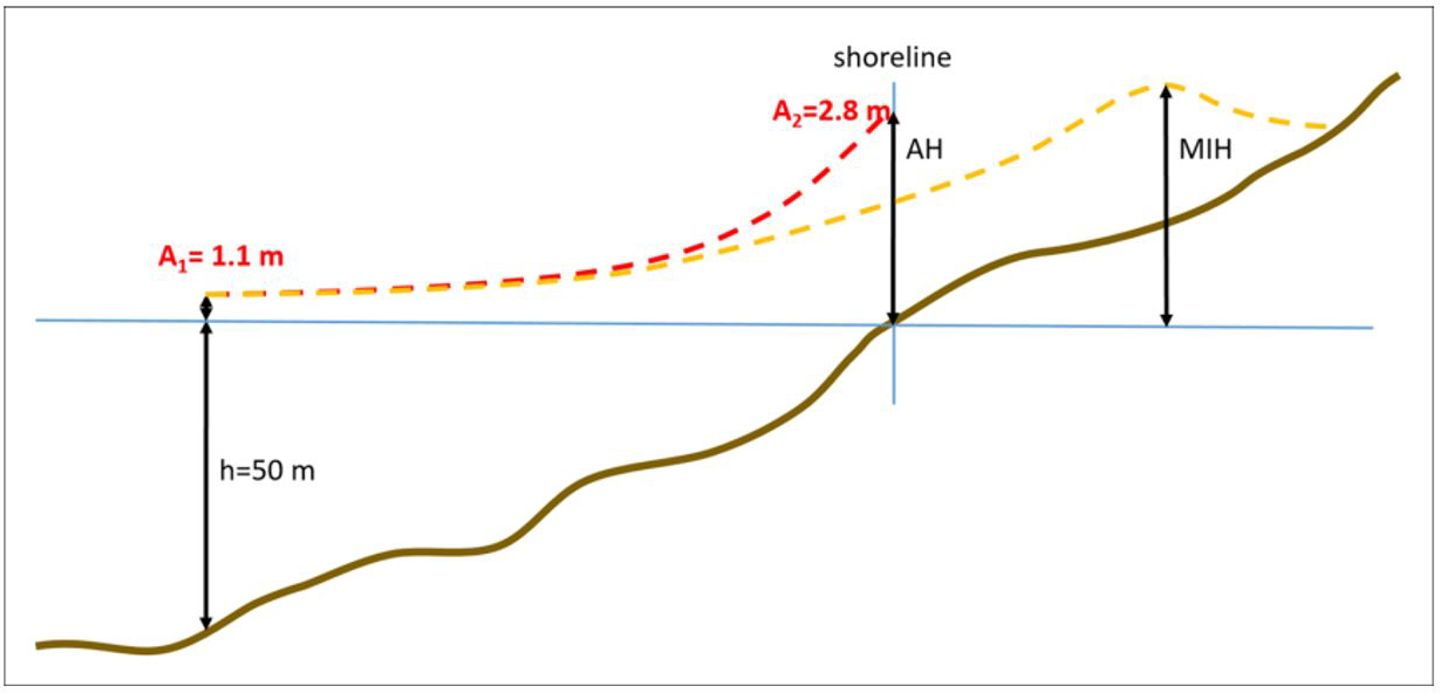 Figure 1: Schematic example for how the amplification factors is used to estimate MIH. A1 is the off-shore surface elevation, and A2 is the estimation of MIH (A2 = A1 * amp.factor).