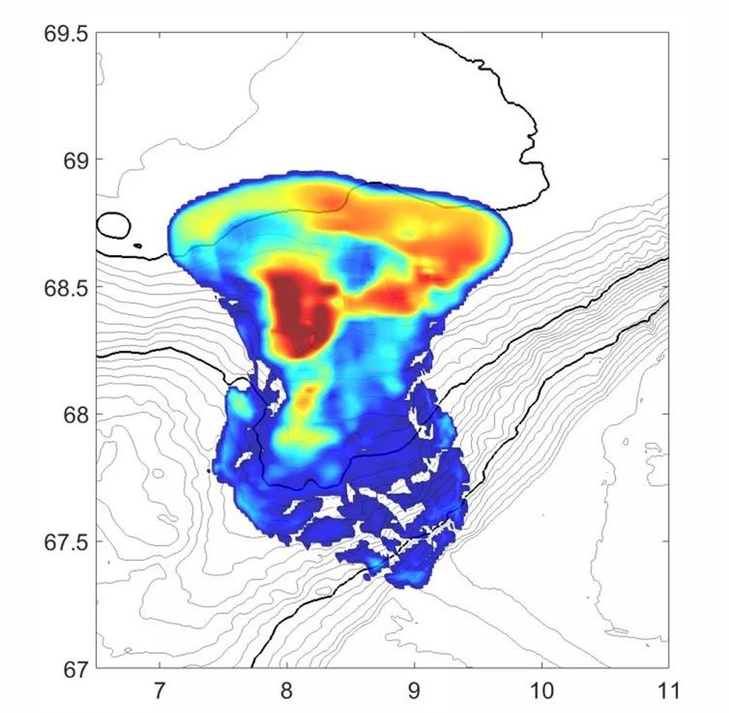 Example of model output from BingClaw for submarine landslide dynamics, Trænadjupet tsunami ~4000 years BP (Løvholt et al., 2017)