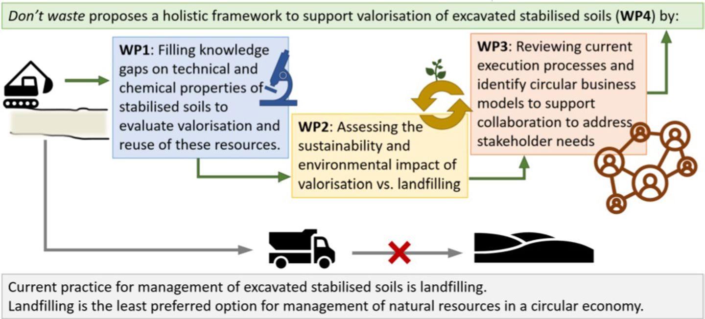 I forskningsprosjektet Don’t Waste er målet å utvikle en praktisk og vitenskapelig basert ramme for å fastslå den mest bærekraftige utnyttelsesmetoden for stabiliserte, oppgravde masser – og dermed unngå deponering.