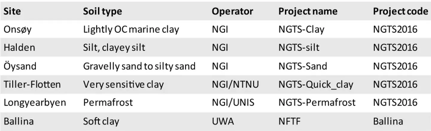 Forskningskonsortiet NGTS ledes av NGI og består i tillegg av NTNU, SINTEF/UNIS og Statens vegvesen. Forsøksfeltene vil brukes som feltlaboratorier for uttesting og verifisering av nye, innovative metoder for grunnundersøkelser og forsøksprosedyrer. De fem forsøksfeltene er valgt ut som representative for en type løsmasse, som omfatter: