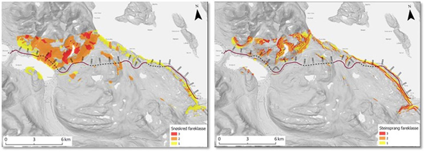 Faregradskart for snøskred (venstre) og steinsparang (høyre)